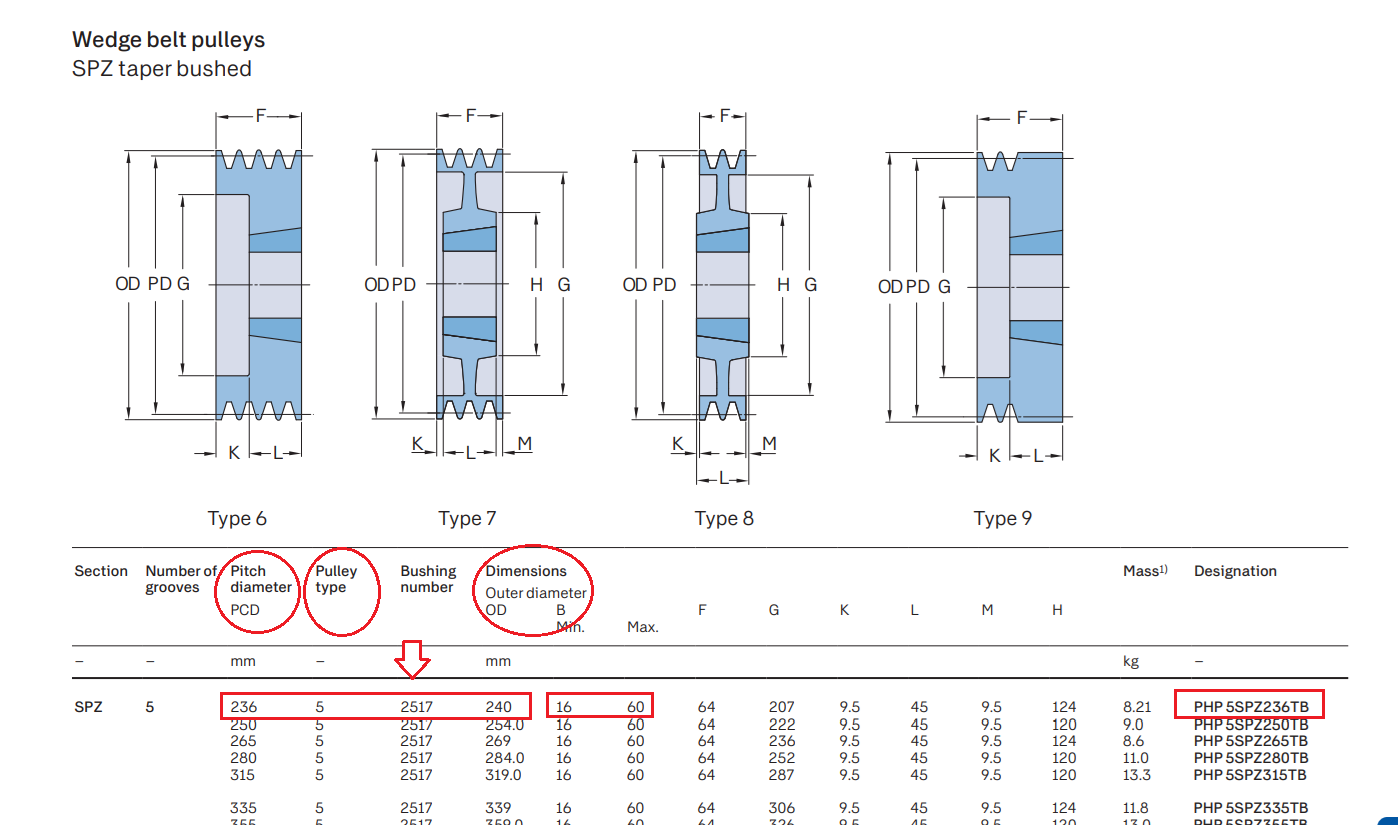 (Ví dụ: Đường kính pulley 5 dãy 236mm , bản đai 3V => chọn pulley: PHP 5SPZ236TB)